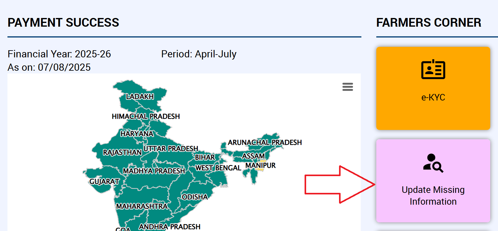 - अब FARMERS Corner में मौजूद विकल्प Update Missing Information पर क्लिक करें.